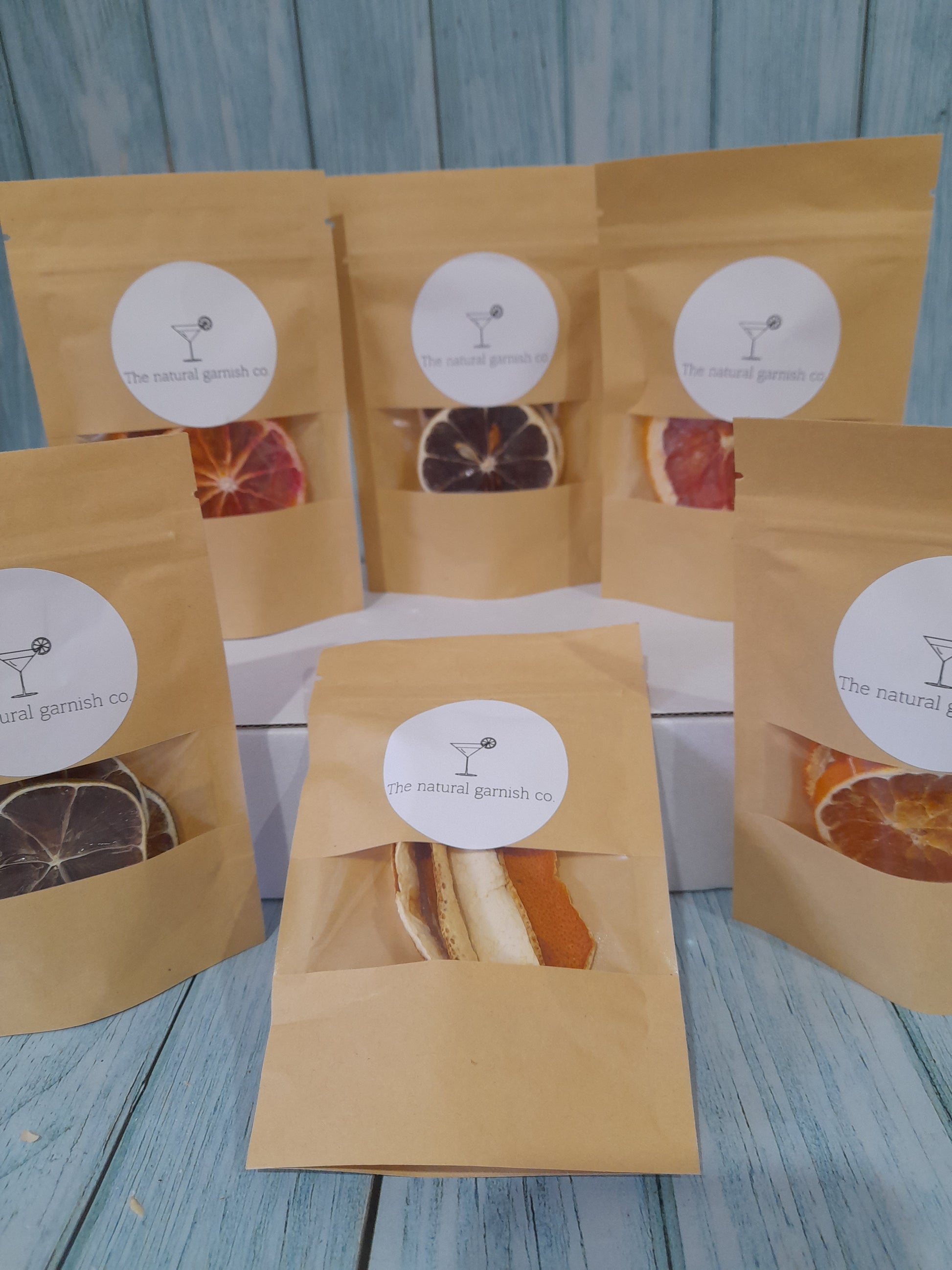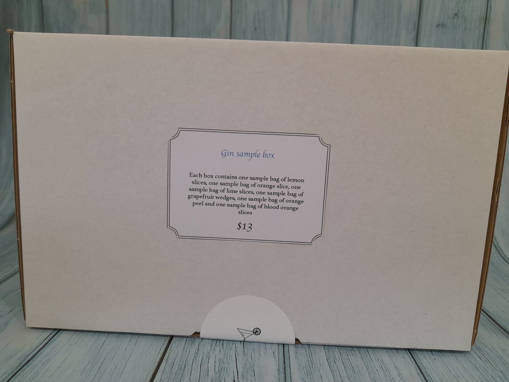 Our gin sample box has 5 fruit samples for you to try with your gin! Grapefruit wedges, Lemon slices, lime slices, blood orange slices, orange slices and orange peel