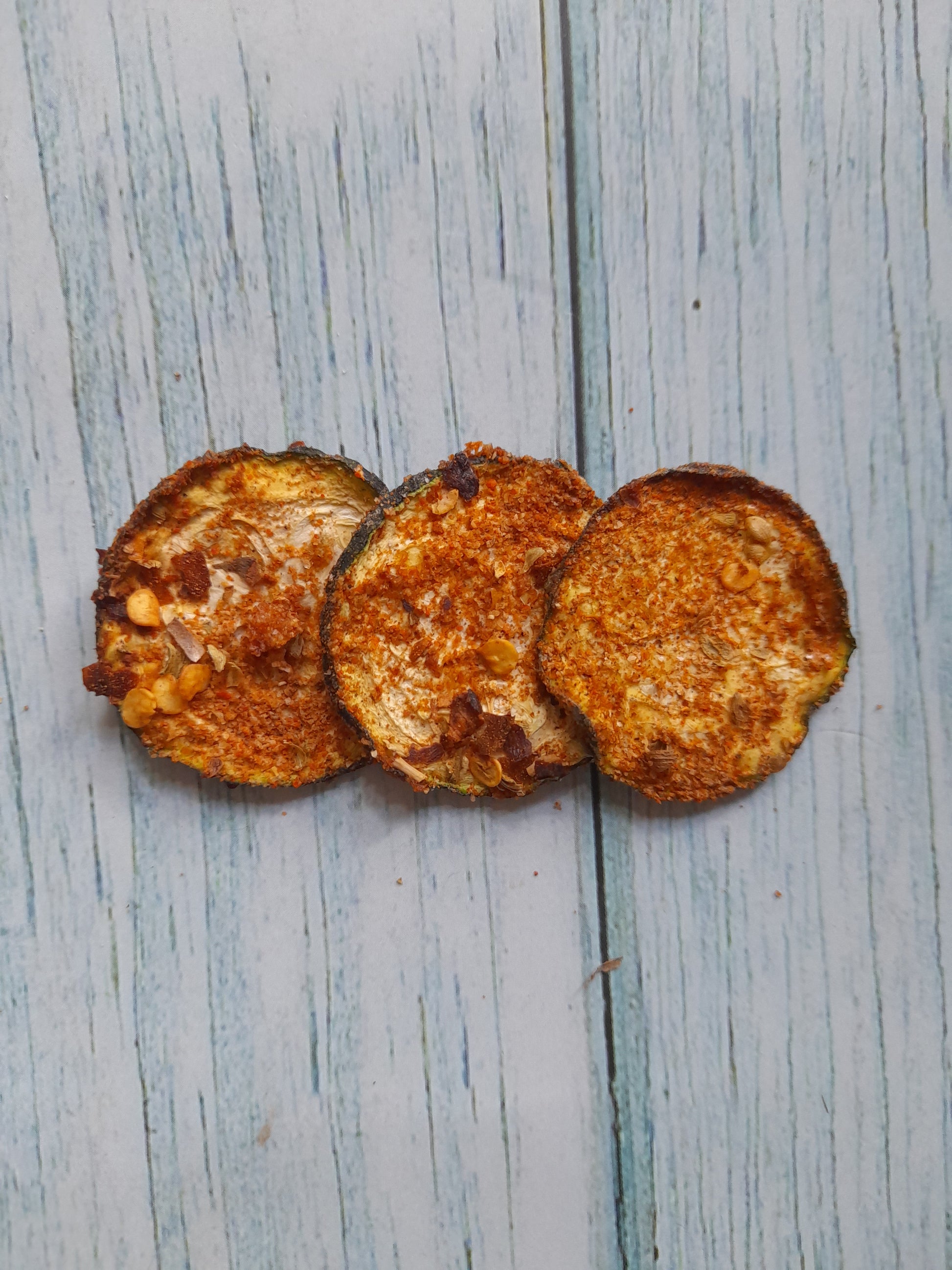 Ingredients for hot chilli- Zucchini, salt, onion powder, garlic powder, hot paprika, oregano, parsley, cayenne pepper, chilli flakes and black pepper.