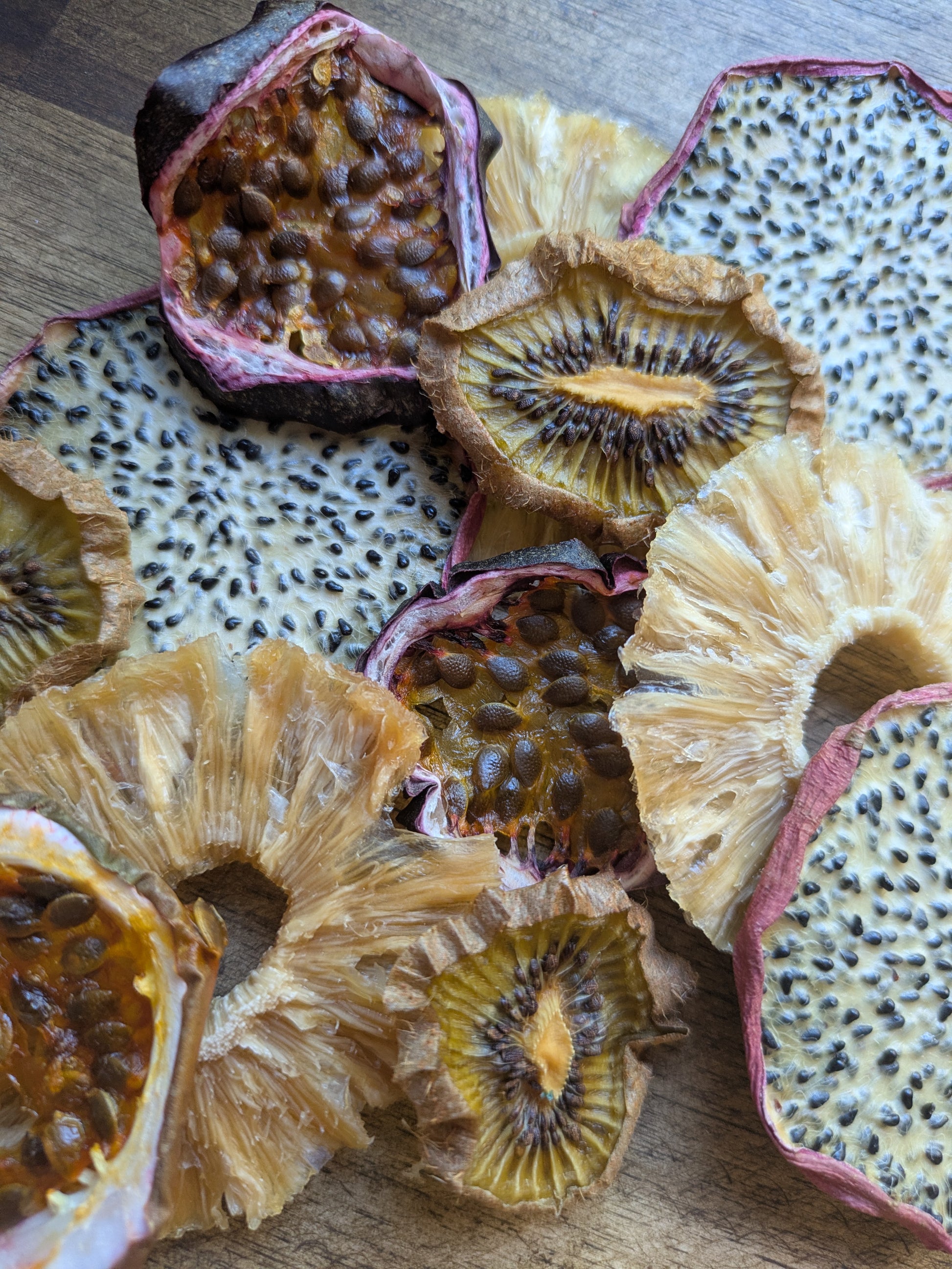 Our summer fruit slice mix contains kiwi, pineapple, dragon fruit and passion fruit slices